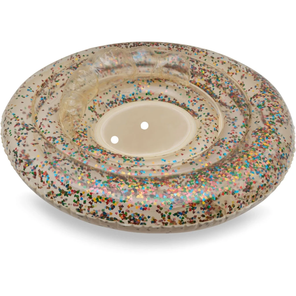 Transparent inflatable swim ring made from durable PVC designed with glitter and confetti inside.
