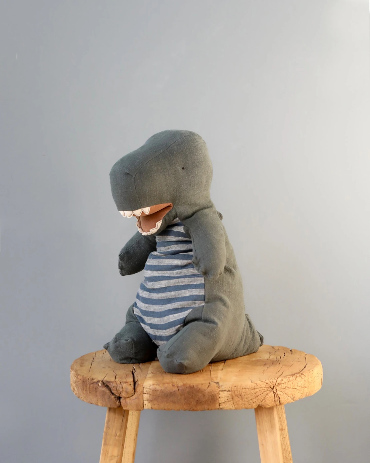 Look at this funny friend! A large Gantosaurus with big teeth has arrived and is ready to play with all of us. It is made in a soft mix of ramie and cotton, the striped stomach is made in a very nice blend of linen and cotton.