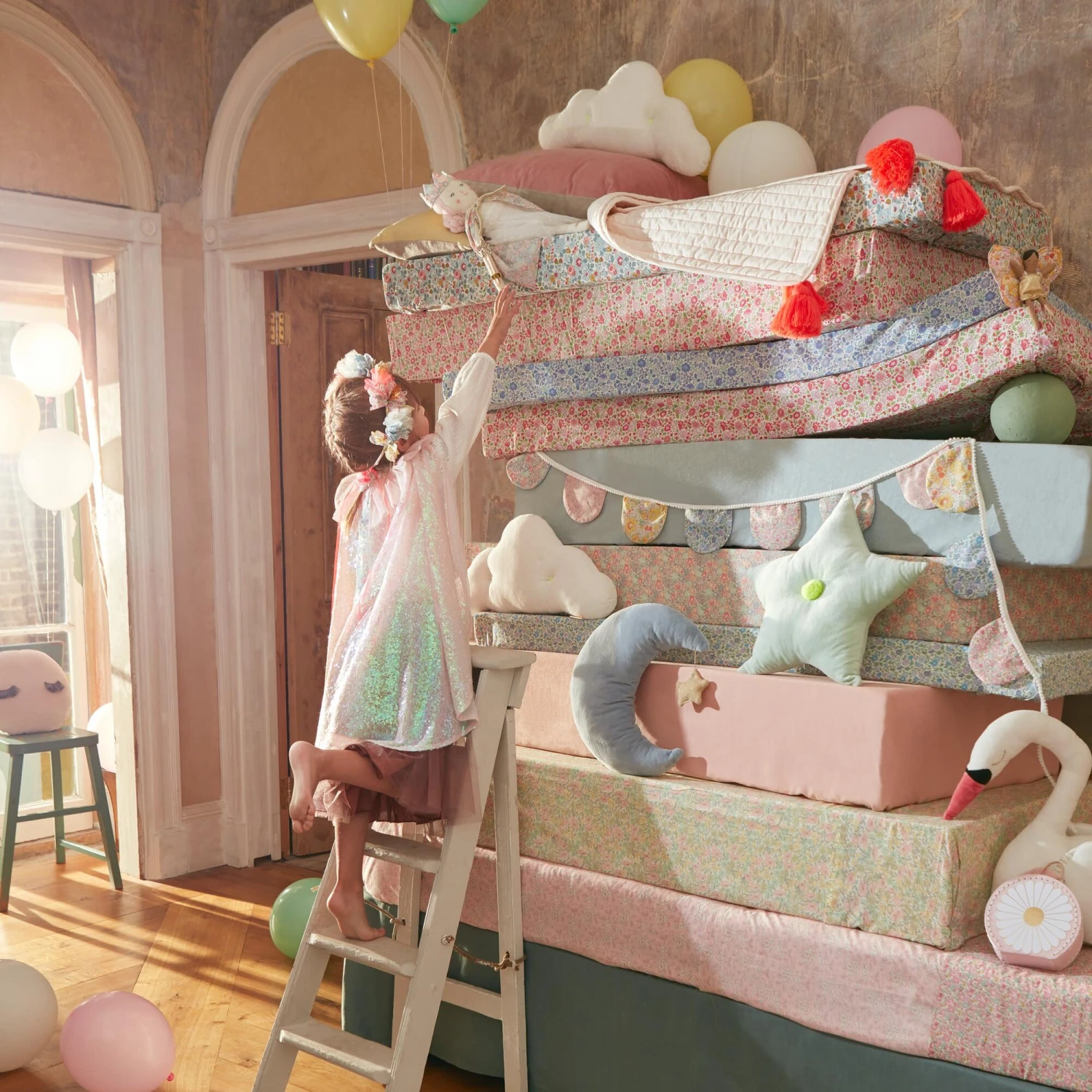This gorgeous cape is the perfect accessory to add a touch of style, flair and color to any outfit. Great for dress-up fun, or to wear to a special celebration. It’s beautifully crafted from an iridescent sequin lined fabric, with a pink tulle collar for a charming touch. It comes with a glittering silver star wand with a shimmering tassel.