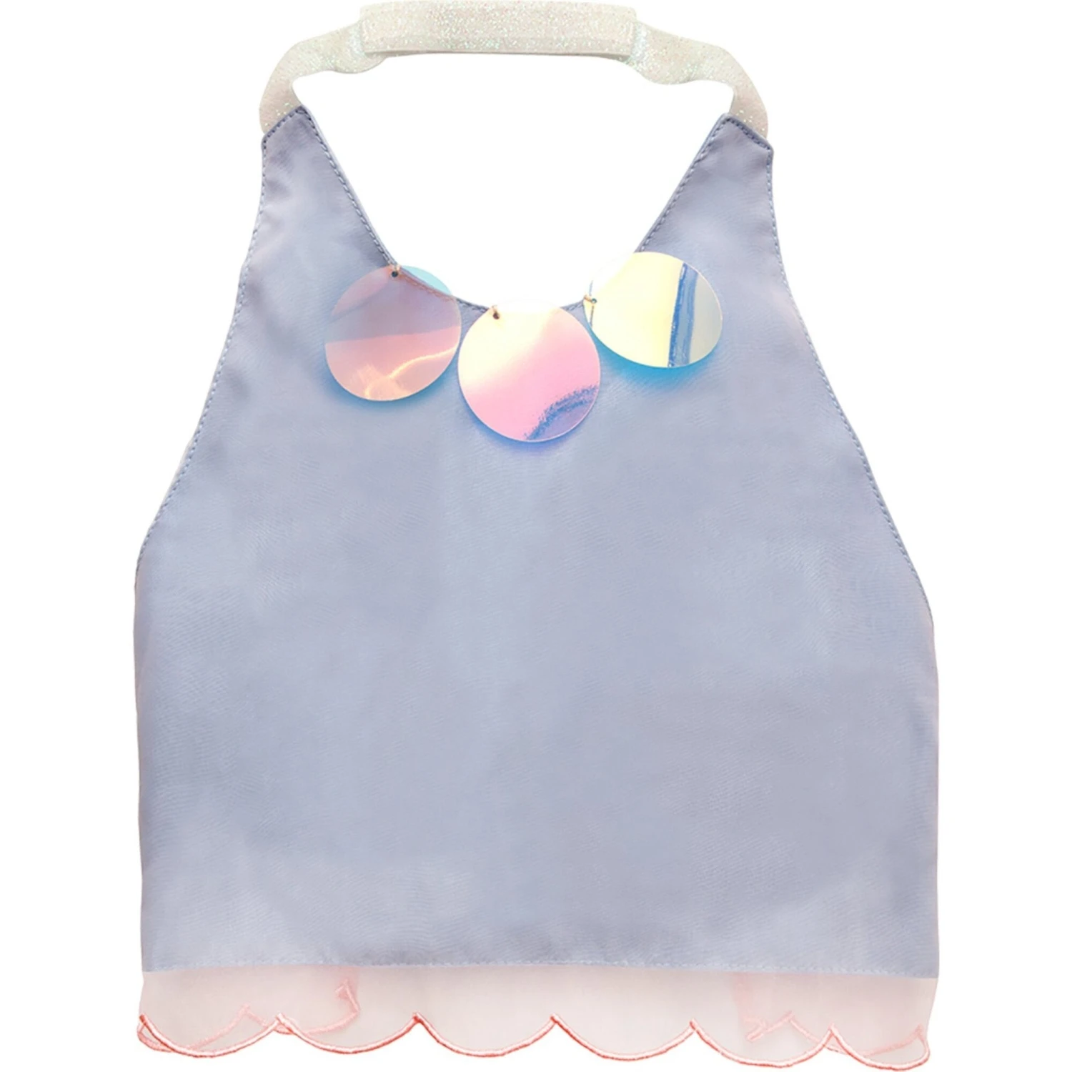- The blue polycotton crop top has a pretty pink organdie layer with a scalloped edge and iridescent sequin detail