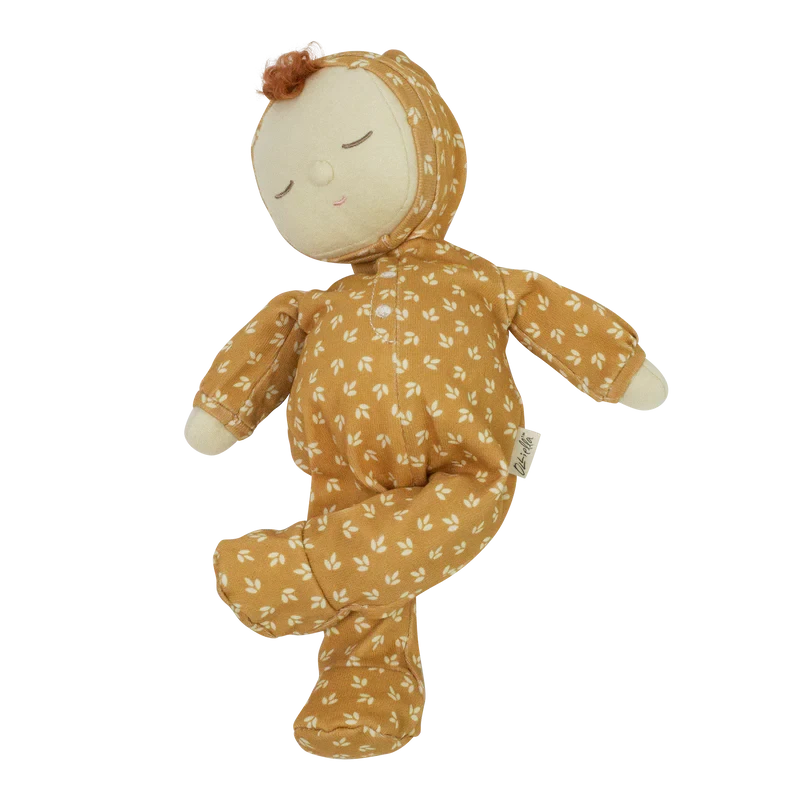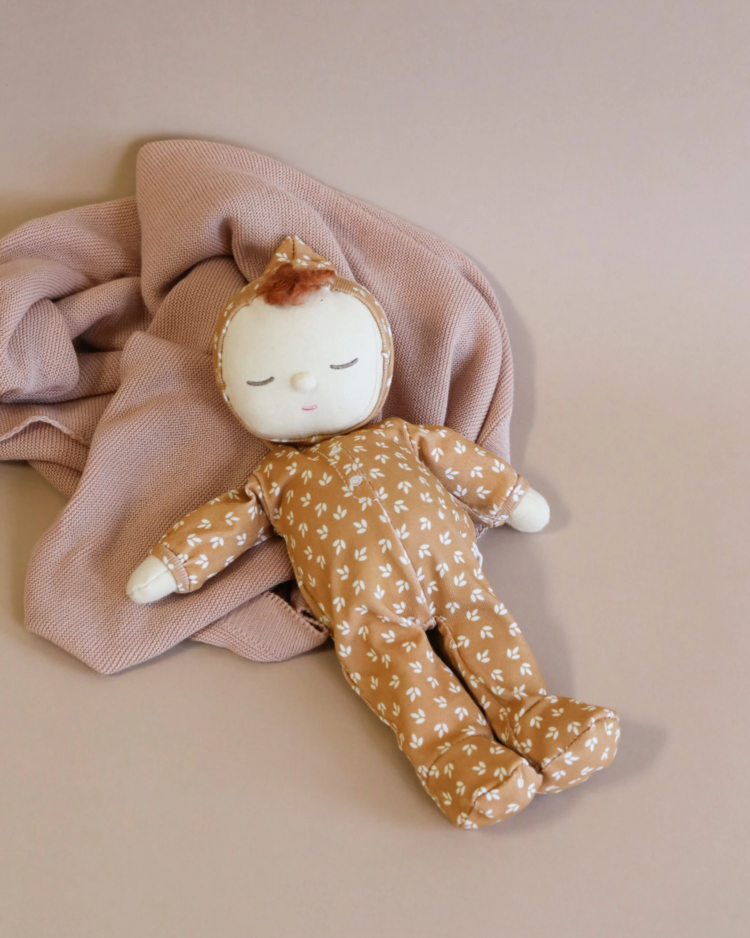 Dozy Bean is posable, made from super soft cotton, and features the sweetest embroidered face with a little tuft of hair. Each Daydream Dozy Dinkum wears a fixed suit with a rainbow right over their heart.