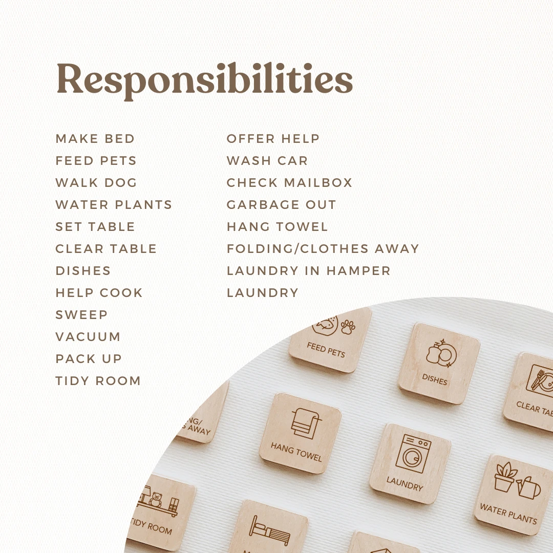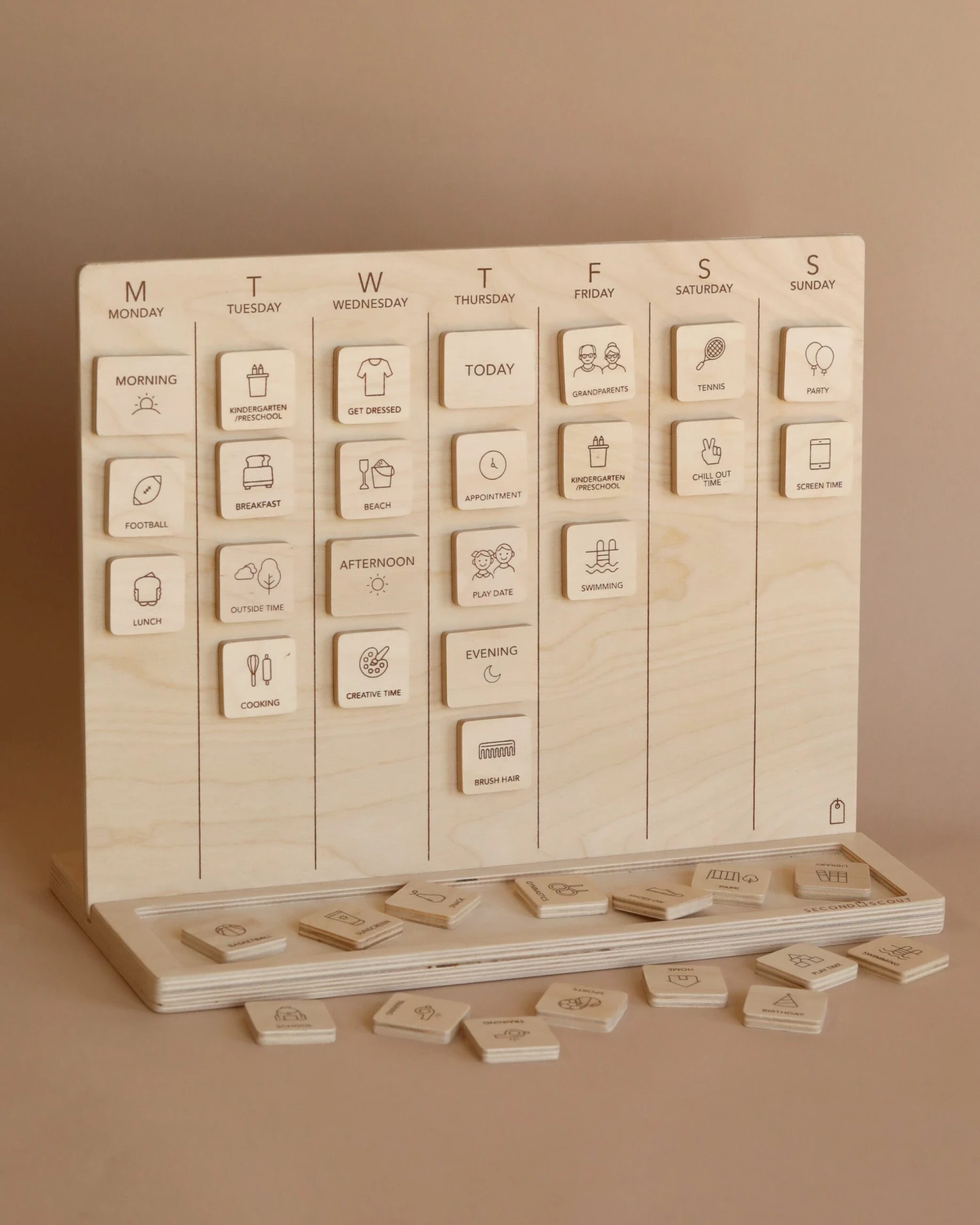 Starter set includes: 1 wooden backing board, 1 wooden base, 4 wooden shift tiles (today, morning, afternoon & evening) and the following tiles: School (side A), Kindergarten/Preschool (side B), Grandparents (side A), Grandparent (side B), swimming, play date, shopping, home, sports, party, birthday, appointment, library, park, eat out/ takeaway & beach.