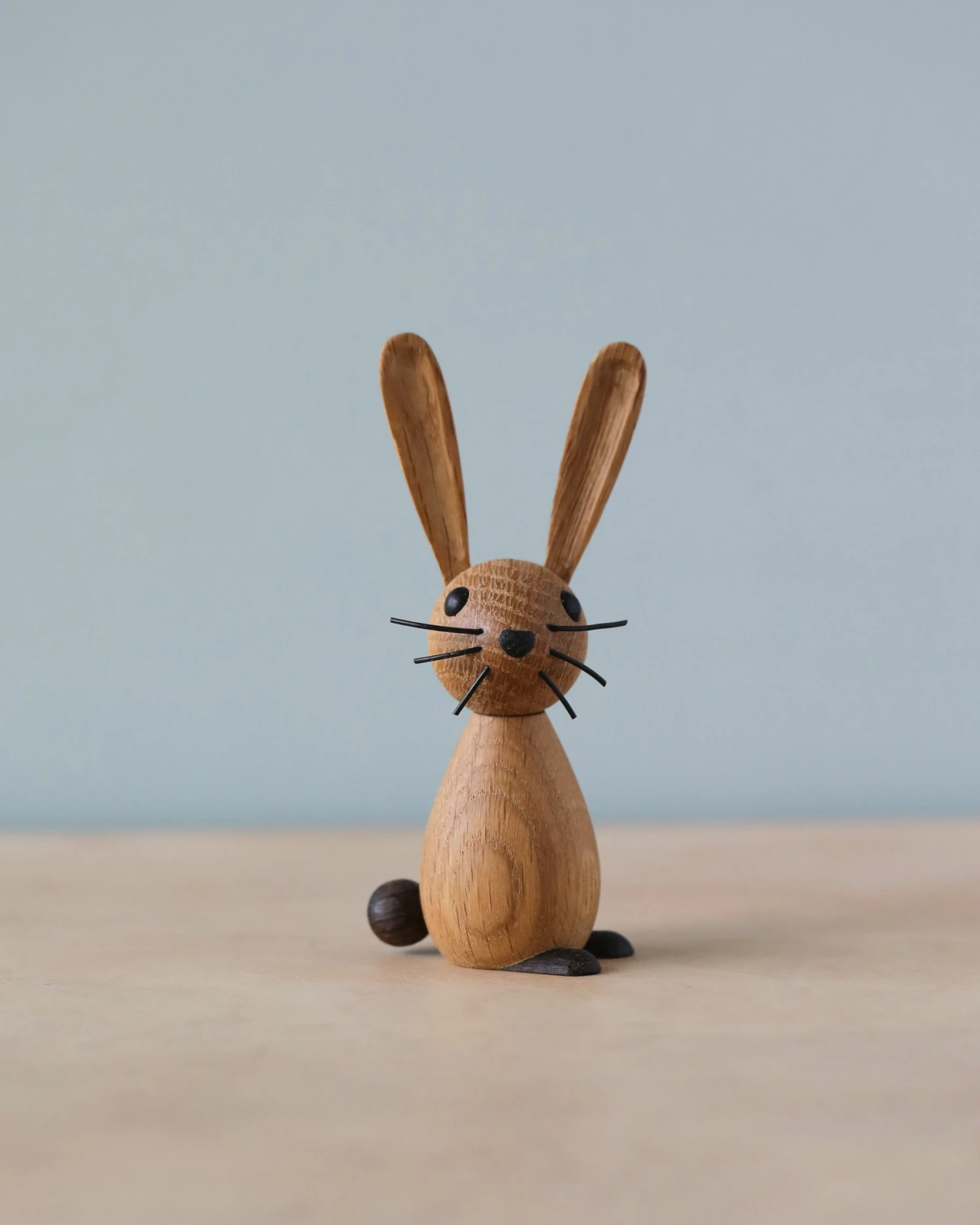 Mini Jumper is a cute hare that brings a spring vibe into your home – all year round. This little version of our big hare, Jumper, has a gentle and curious expression and you can turn his head so that he can look around. Mini Jumper is handmade of pure oak and with details in smoked oak.