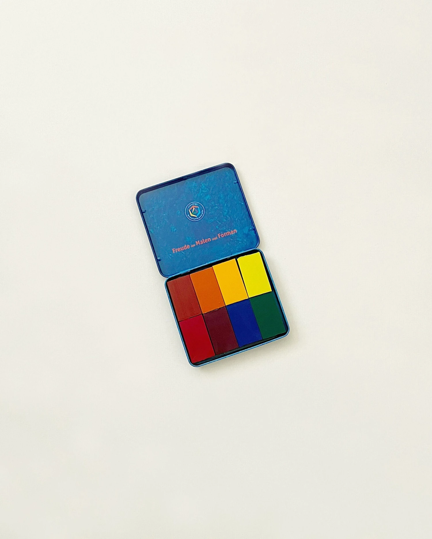 Tin case, 8 blocks each 1.61 x 0.91 x 0.47 inches (41x23x12 mm), with scrapers, 8 assorted Waldorf colors