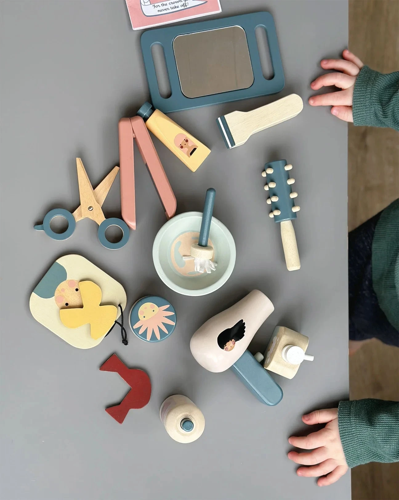 For all hair types, colors and styles, this hair salon offers a full range of hair treatment and styling opportunities. Finished in gender-neutral colors, a tabletop swivel mirror with a storage shelf and a hole for the hair dryer.