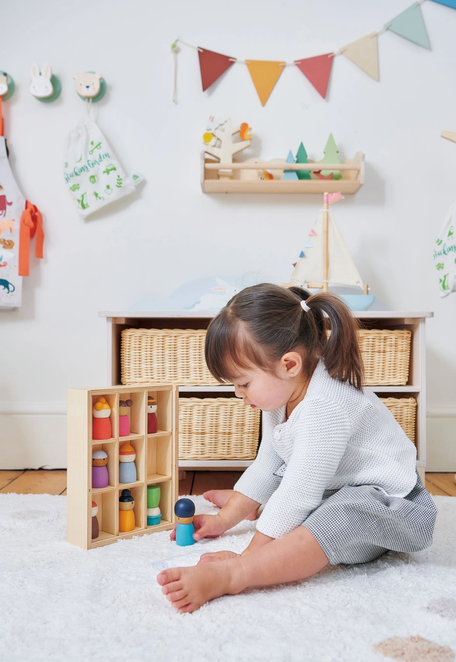 Part of our open-ended play, meet the 9 folks who reside at the happy hotel. Made from solid wood, colored with a soft water based stain, they can represent anyone you know. These little people are perfect for adding to any sort of creative or imaginative play, and can be perched easily on any surface.