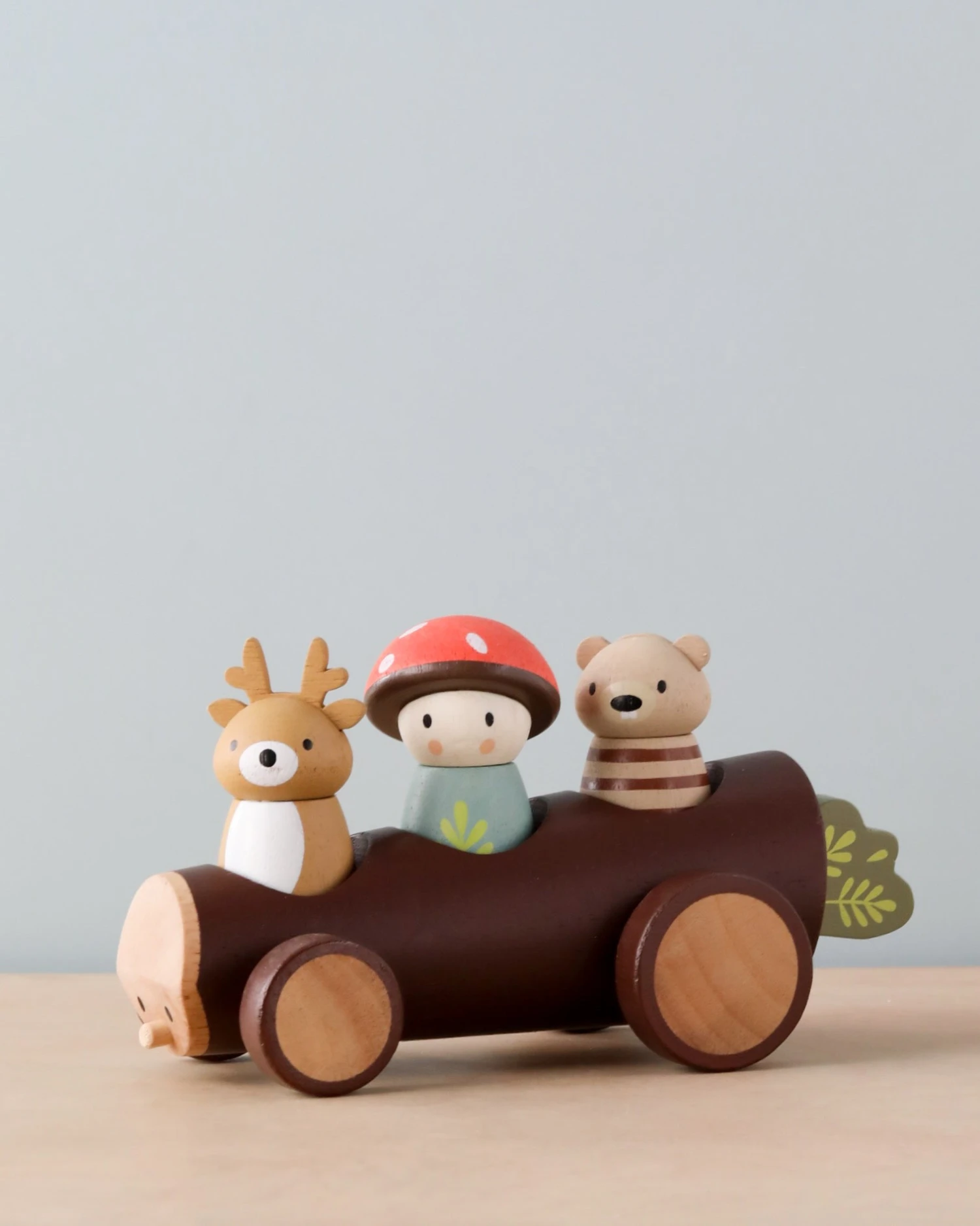 Call a taxi! Get around in style and pick up the Merrywood folks in this quirky log-shaped vehicle. Grabbing a ride today is Fungi, Robbie, and Woody.