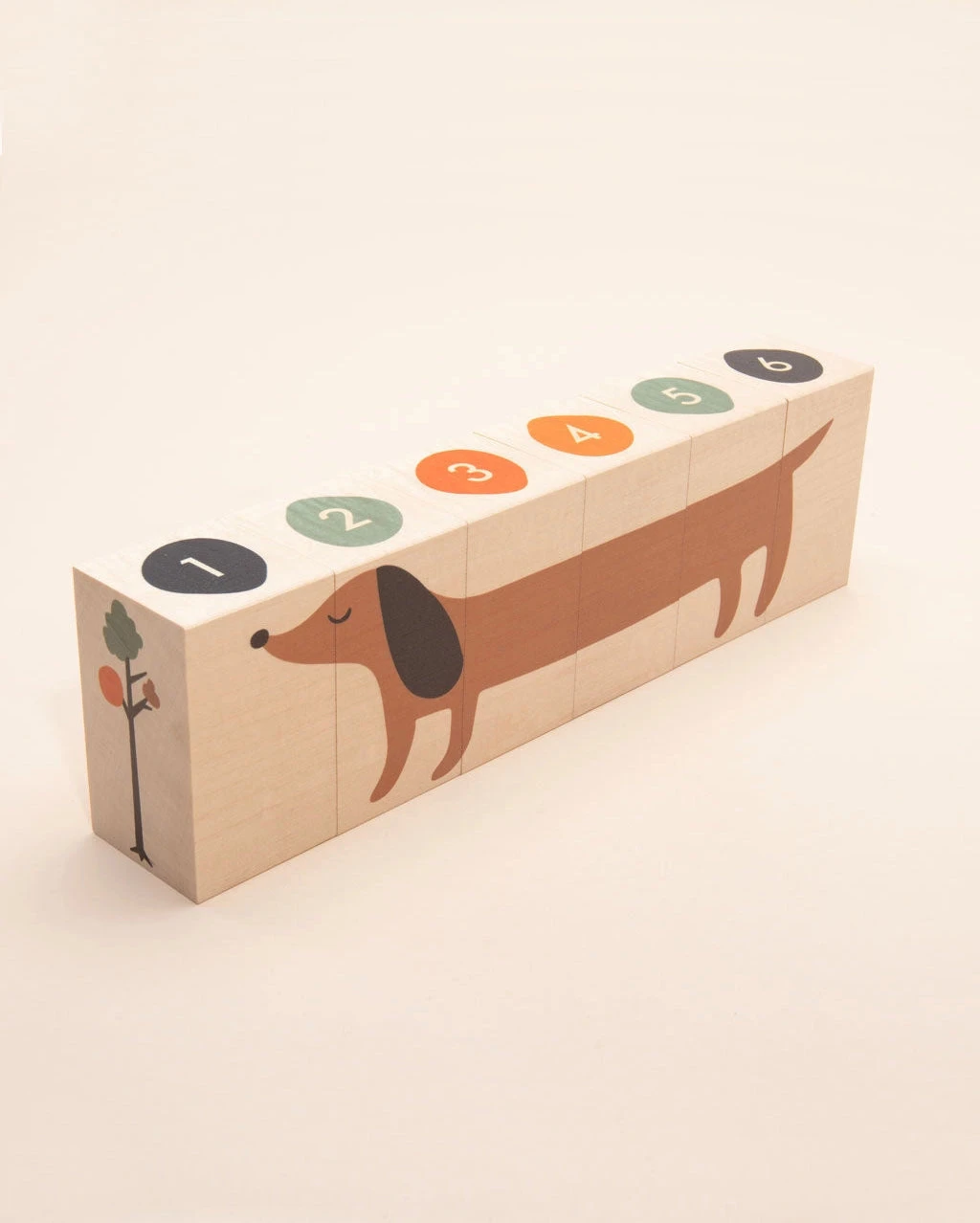 Explore the neighborhood environment. Count six houses. See how the weather changes with rains, clouds, sun, and moon. Put the dog puzzle together and measure eighteen inches with a ruler. This artful set is fun for play, and a pleasure to display.